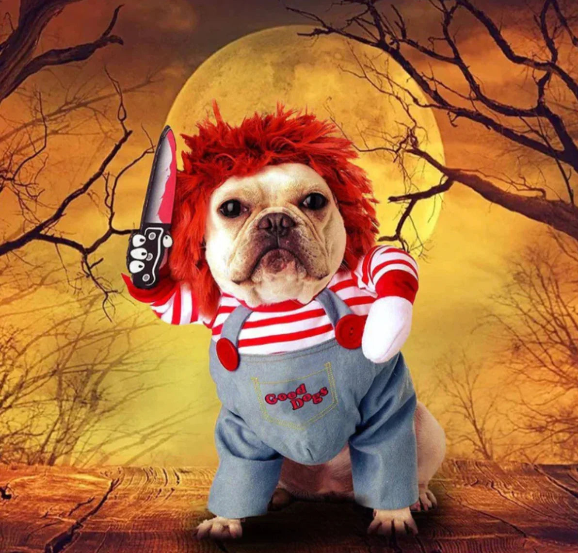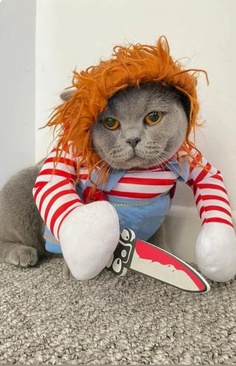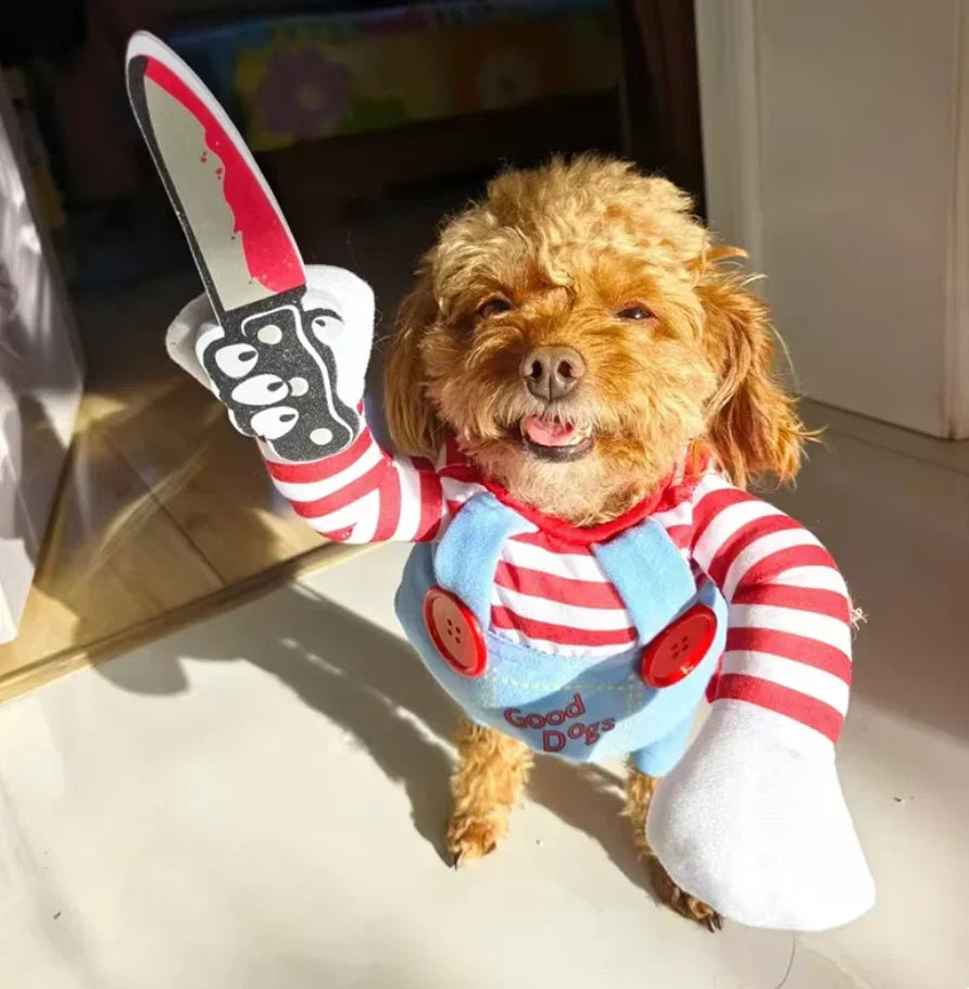 Our Chucky Dog Costume features a padded body, striped sleeves, and a realistic knife accessory for the ultimate creepy look. Perfect for Halloween parties, cosplay events, or funny pet photos, this costume will make your pup the star of the night.