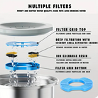 Multiple filters with activated carbon and ion exchange resin purify and soften the water, removing odors and metal ions for healthier drinking.
