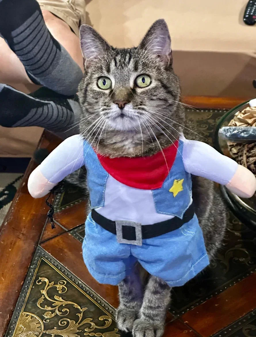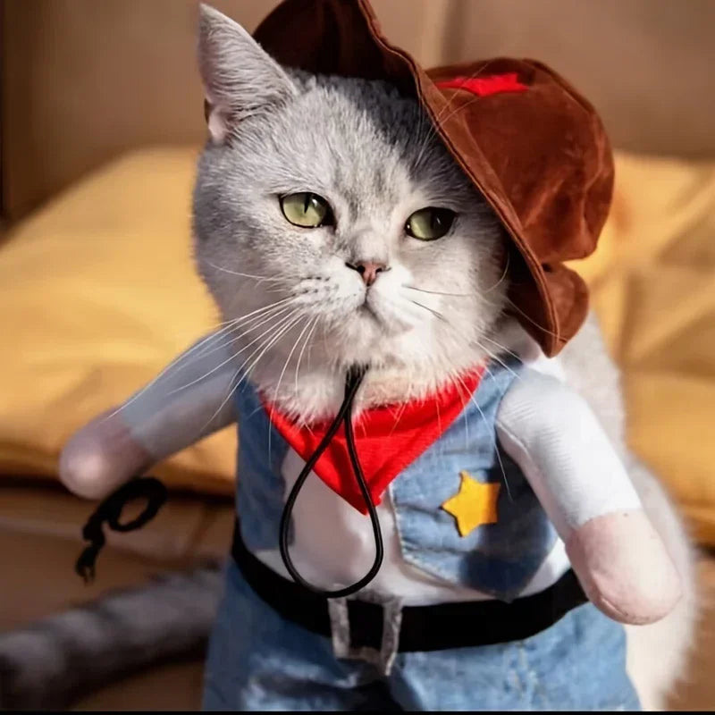Transformez votre chat en shĂ©rif adorable avec notre costume de cowboy pour chat . Ce dĂ©guisement western hilarant, composĂ© d'une combinaison en jean, d'une Ă©toile de shĂ©rif et d'un chapeau de cowboy , transforme instantanĂ©ment votre fĂ©lin en star de toutes les fĂȘtes.